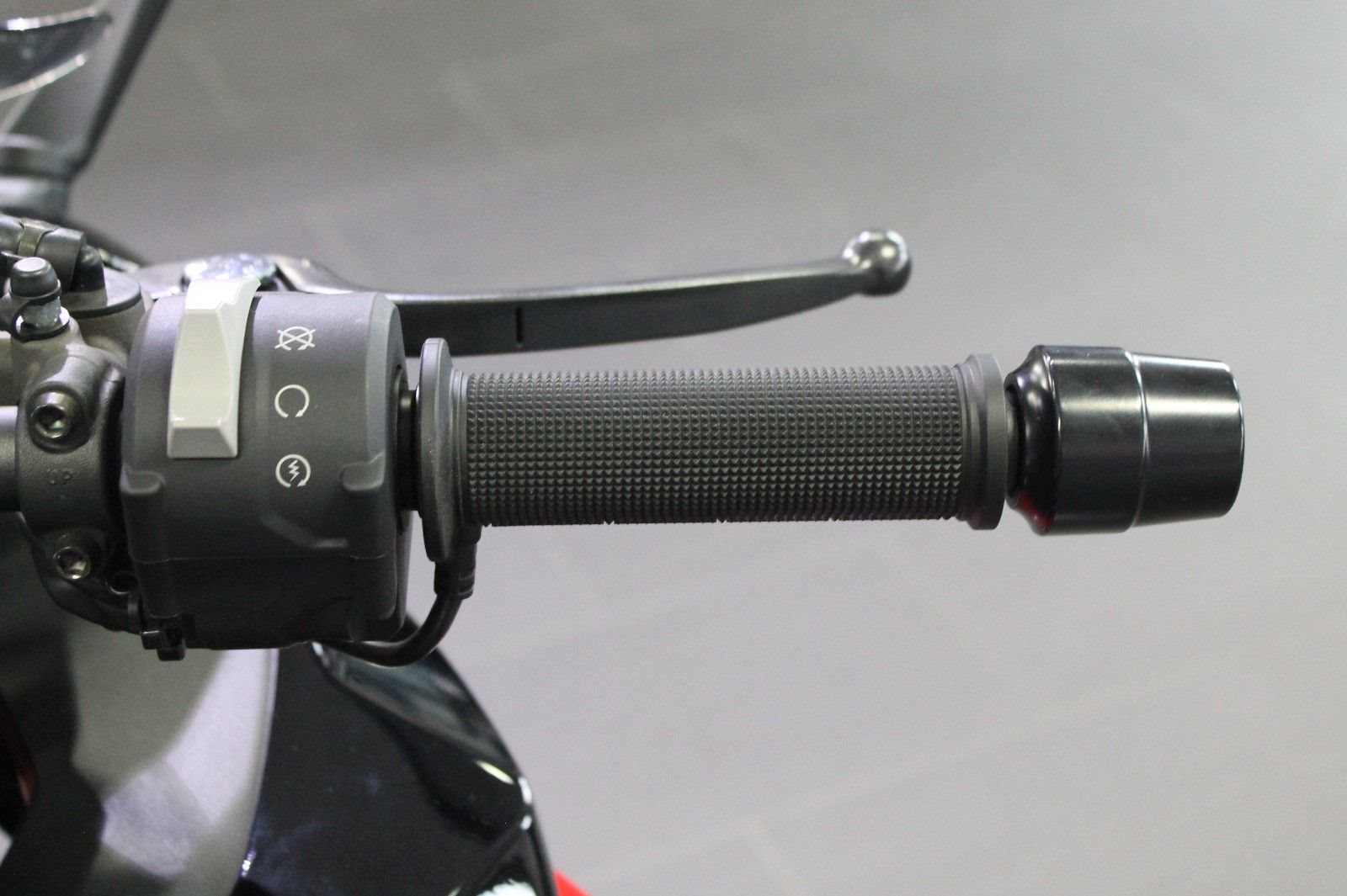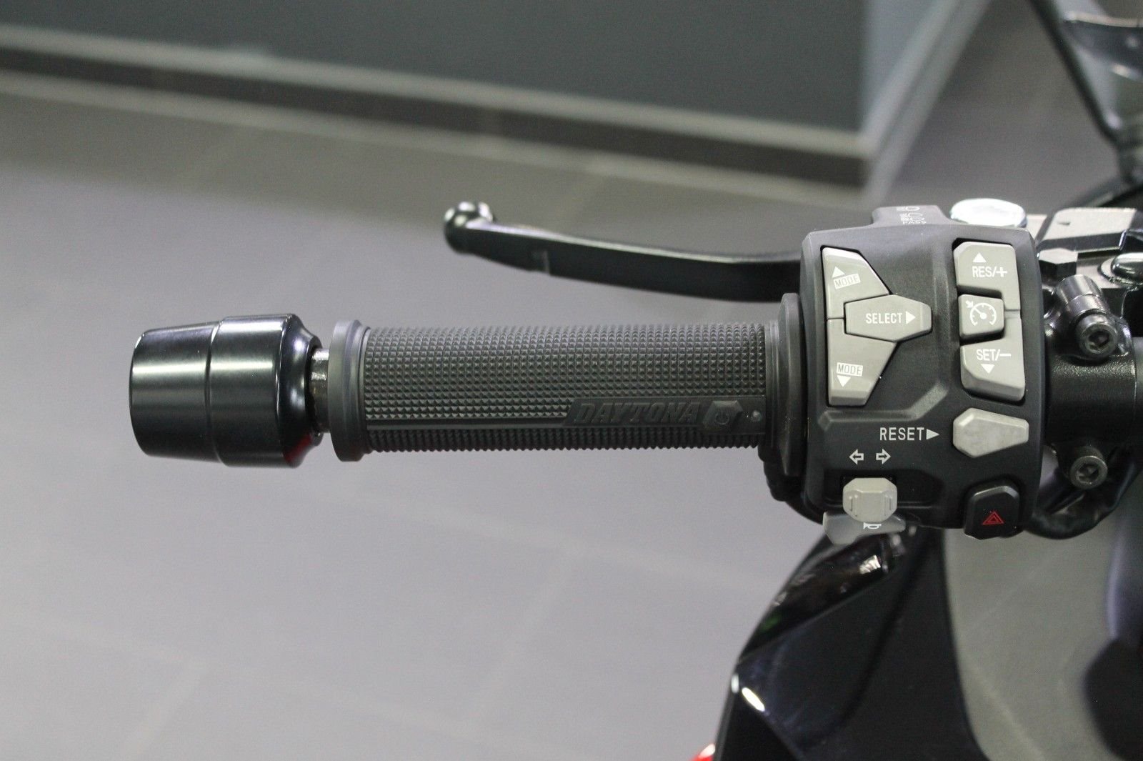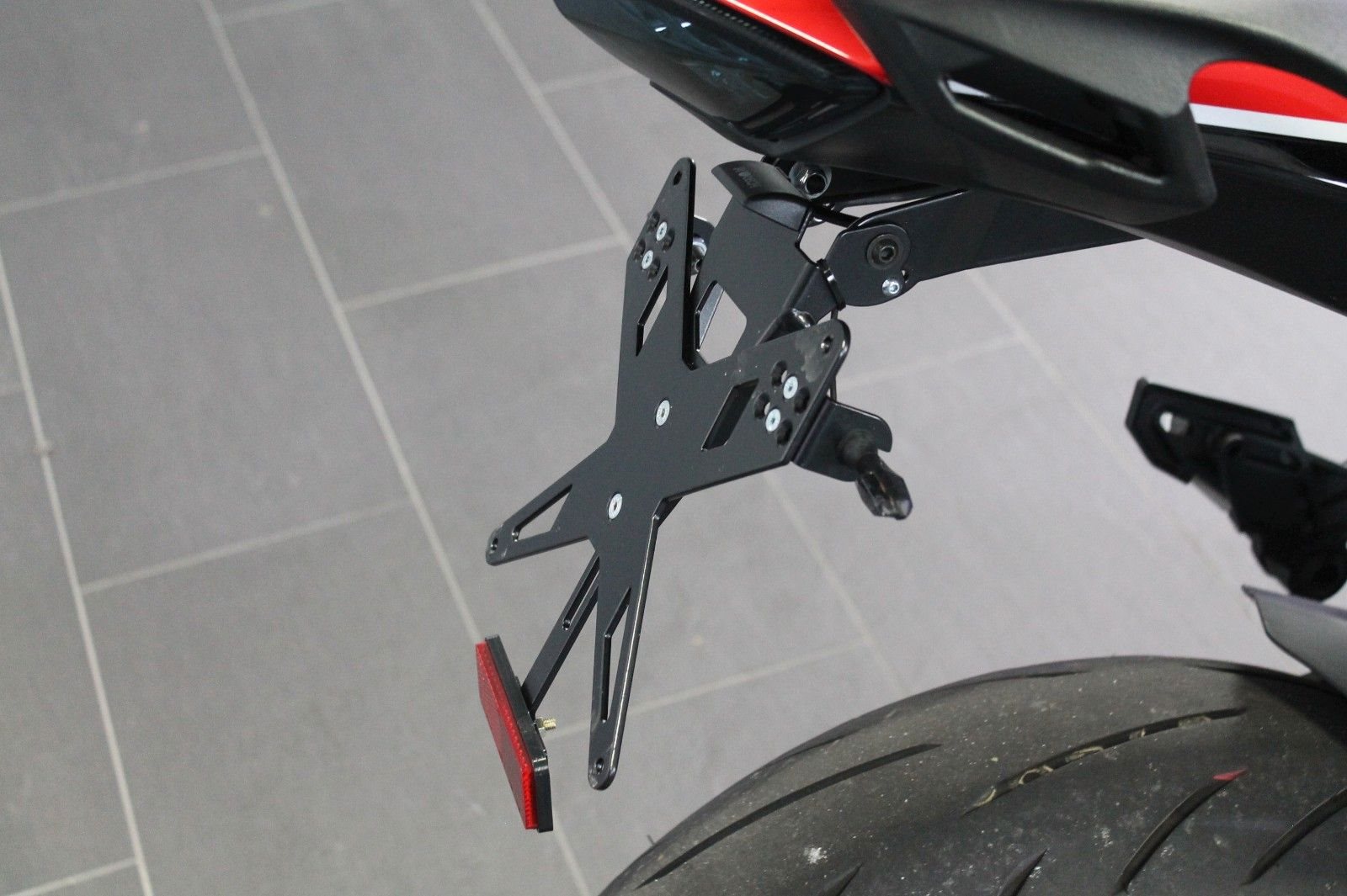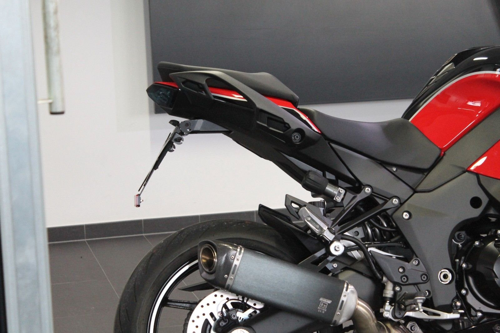 Es sind eine Bodis-Auspufanlage, ein kurzer Kennzeichenträger mit Miniblinkern, eine Touringscheibe und Heizgriffe montiert.